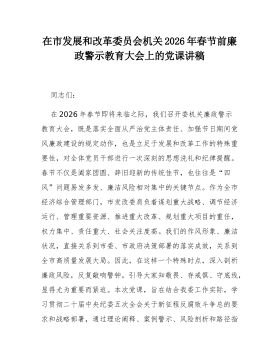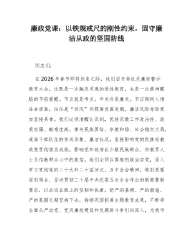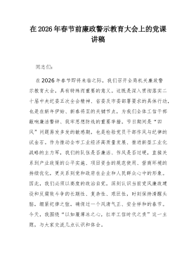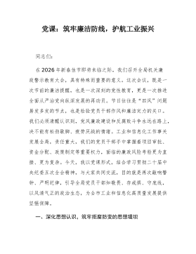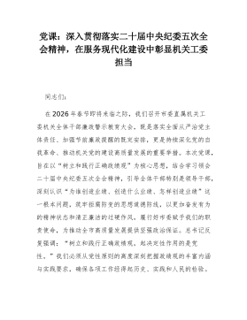 党课:深入贯彻落实二十届中央纪委五次全会精神,在服务现代化建设中彰显机关工委担当同志们:在2026年春节即将来临之际,我们召开市委直属机关工委机关全体干部廉政警示教育大会,既是落实全面从严治党主体责任、加强节前廉政提醒的既定安排,更是持续深化党的自我革命、推动机关党的建设高质量发展的重要举措。本次党课,旨在以“树立和践行正确政绩观”为核心思想,结合学习领会二十届中央纪委五次全会精神,引导全体干部特别是领导干部,深刻认识“为谁创造业绩、创造什么业绩、怎样创造业绩”这一根本问题,筑牢拒腐防变的思想道德防线,以更加奋发有为的精神状态和清正廉洁的过硬作风,履行好市委赋予我们的职责使命,为推动全市高质量发展提供坚强政治保证。总书记反复强调:“树立和践行正确政绩观,起决定性作用的是党性。”我们必须从党性...