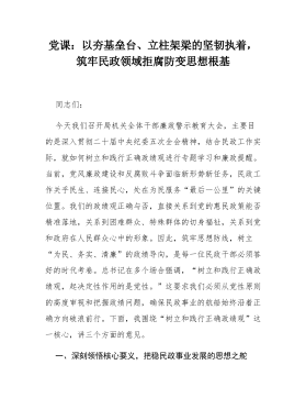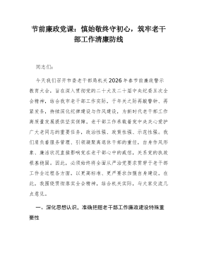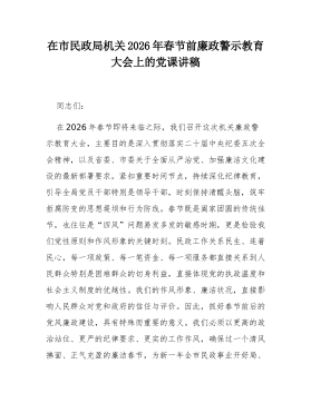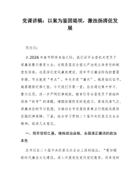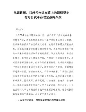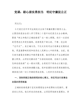 党课讲稿:以“政如农功”的勤勉深耕,筑牢老干部工作高质量发展根基同志们:在新春佳节即将来临之际,我们召开局机关全体干部廉政警示教育大会,这既是落实全面从严治党主体责任、加强节日期间党风廉政建设的例行安排,更是一次深化思想认识、筑牢思想防线的集中动员。结合贯彻落实二十届中央纪委五次全会关于“突出常态长效深化落实中央八项规定精神”“重拳纠治干部群众反映强烈的形式主义、官僚主义”等最新部署要求,今天的党课,我重点围绕“树立和践行正确政绩观”这一核心主题,与大家作一次交流。老干部工作政治性强、政策性强、服务性强,我们所创造的“政绩”,直接关系到党的老干部政策能否落地生根,关系到广大老同志的切身利益与晚年幸福,关系到党执政根基的稳固与社会和谐稳定。我们必须清醒认识到,在老干部工作领域,任何脱离实际、急...