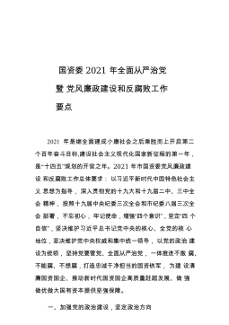 国资委2021年全面从严治党暨党风廉政建设和反腐败工作要点2021年是继全面建成小康社会之后乘胜而上开启第二个百年奋斗目标,建设社会主义现代化国家新征程的第一年,是“十四五”规划的开官之年。2021年市国资委党风廉政建设和反腐败工作总体要求:以习近平新时代中国特色社会主义思想为指导,深入贯彻党的十九大和十九届二中、三中全会精神,按照十九届中央纪委三次全会和市纪委八届三次全会部署,不忘初心,牢记使命,增强“四个意识”,坚定“四个自信”,坚决维护习近平总书记党中央的核心、全党的核心地位,坚决维护党中央权威和集中统一领导,以党的政治建设为统领,坚持党要管党、全面从严治党,一体推进不敢腐、不能腐、不想...