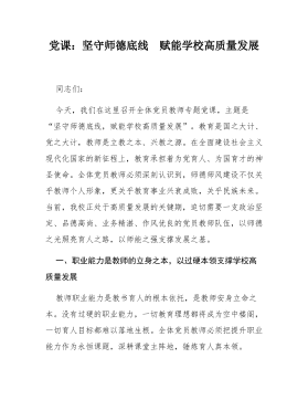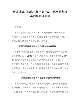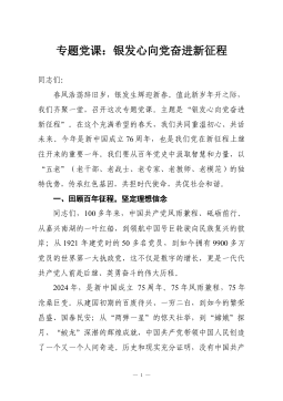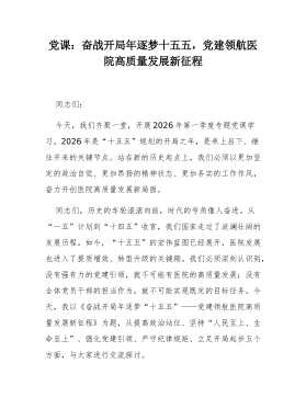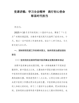 党课讲稿:学习全会精神践行初心使命彰显时代担当同志们:2025年10月召开的党的二十届四中全会,擘画了“十五五”时期发展蓝图,为推进中国式现代化指明了前进方向。今天,我以一名中医药工作者的身份,结合个人学习体会,与大家交流几点认识。一、深刻领悟党建工作的根本意义,始终把政治建设摆在首位(一)坚持党的全面领导是中医药事业发展的根本保证回顾中医药事业的发展历程,每一步跨越都离不开党的坚强领导。新中国成立以来,从最初的中西医并重方针到如今的中医药传承创新发展国家战略,党始终把人民健康放在优先发展的战略位置。特别是党的十八大以来,以同志为核心的党中央把中医药工作摆在更加突出的位置,中医药事业迎来天时地利人和的大好时机。学习二十届四中全会精神,更加深刻体会到,坚持党的全面领导是中国特色社会主义最本质的...