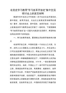 在党史学习教育“学习改革开放史”集中交流研讨会上的发言材料根据中共中央办公厅印发的《关于在全社会开展党史、新中国史、改革开放史、社会主义发展史宣传教育的通知》要求,我办的党史、新中国史、改革开放史、社会主义发展史的学习教育活动已开展了一段时间。下面我围绕“学习改革开放史”这一主题与大家进行交流研讨,希望和各位同志共同学习共同进步。一、学习改革开放史,要深刻认识改革开放的伟大意义在改革开放之前,中国依旧是一个农业人口大国。当时,农村人口占国家总人口的比重高达83%,并且这些人口可以说是属于绝对贫困人口。再加上社会主义经历了艰难的曲折探索阶段,中国当时的社会经济情势不容乐观。正是在这样一种极端困难...