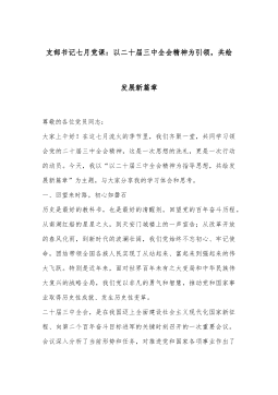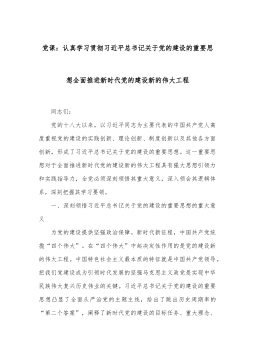 党课:认真学习贯彻习近平总书记关于党的建设的重要思想全面推进新时代党的建设新的伟大工程 同志们: 党的十八大以来,以习近平同志为主要代表的中国共产党人高度重视党的建设的实践创新、理论创新、制度创新以及其他各方面创新,形成了习近平总书记关于党的建设的重要思想。这一重要思想对于全面推进新时代党的建设新的伟大工程具有强大思想引领力和实践指导力,全党必须深刻领悟其重大意义,深入领会其逻辑体系,深刻把握其学习要领。 一、深刻领悟习近平总书记关于党的建设的重要思想的重大意义 为党的建设提供坚强政治保障。新时代新征程,中国共产党统揽“四个伟大”。在“四个伟大”中起决定性作用的是党的建设新的伟大工程。...