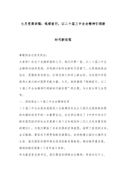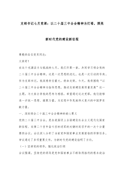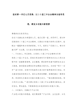 驻村第一书记七月党课:以二十届三中全会精神为指导思想,建设乡村振兴新图景尊敬的各位党员同志:在这个充满生机与希望的七月,我们汇聚一堂,共同学习、探讨和实践党的二十届三中全会精神,以期在乡村振兴的伟大征程中,绘制出一幅幅和美乡村的新画卷。今天,我将以“沉稳之心,铸乡村振兴梦”为主题,与大家分享我的感悟与思考。一、不忘初心,牢记使命,以党的二十届三中全会精神为引领党的二十届三中全会,是我们党在新时代中国特色社会主义伟大征程中的一座重要里程碑。会议强调,要坚持和完善中国特色社会主义制度,推进国家治理体系和治理能力现代化,为实现“两个一百年”奋斗目标、实现中华民族伟大复兴的中国梦提供有力保证。作为基层...