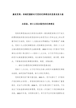 廉政党课:准确把握新时代党的纪律建设的显著成效与基本经验,持之以恒加强党的纪律建设 党的纪律是指由成文的党内法规和一般性制度安排以及不成文的惯例规矩所规定的各级党组织和全体党员在工作和生活上所必须遵守的行为准则。党的十八大报告首次明确提出“纪律建设”的概念,党的十九大把纪律建设纳入党的建设总体布局,党的二十大对全面加强党的纪律建设作出战略部署,2023年年底《中国共产党纪律处分条例》再次修订……党的十八大以来,以习近平同志为核心的党中央高度重视纪律建设,结合新时代的新情况、新问题、新特点,不断推进党的纪律建设的理论、制度、实践创新。 一、新时代加强党的纪律建设取得的显著成效 党的十八大以...