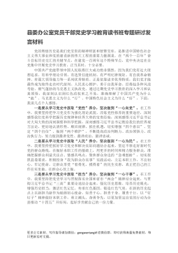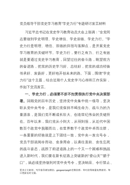 党员领导干部党史学习教育“学史力行”专题研讨发言材料习近平总书记在党史学习教育动员大会上强调:“全党同志要做到学史明理、学史增信、学史崇德、学史力行。”学史力行是明理、增信、崇德的归宿与落脚点,是开展党史学习教育的关键环节。学史力行,要行之有力、行之有效就是要通过党史学习教育,回望过往的奋斗路,眺望前方的奋进路,把党的历史学习好、总结好,把党的成功经验传承好、发扬好,更好地开创未来的路。下面,围绕“学史力行”这个主题,结合近期个人党史学习心得和工作实际,作如下交流发言。一、学史力行,必须要不折不扣贯彻执行党中央决策部署。回顾党的百年历史,坚持党中央集中统一领导,坚决听从党中央号令,是我们党保持...