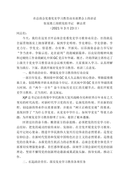 在总商会党委党史学习教育动员部署会上的讲话张家港工商联党组书记解志荣(2021年3月23日)同志们:今天,我们在这里召开总商会党委党史学习教育动员会,目的就是全面贯彻落实上级部署要求,做到学史明理、学史增信、学史崇德、学史力行,学党史、悟思想、办实事、开新局,以昂扬姿态奋力书写好“争当表率、争做示范、走在前列”的港城新篇章,以良好的精神风貌和过硬的工作业绩献礼中国GC党百年华诞。刚才,许海萍副主席传达了上级关于党史学习教育动员会议相关精神,大家要深入学习,认真理解努力践行。下面,我就开展好党史学习教育,再讲三点意见。一、提升政治站位,增强党史学习教育的行动自觉一部百年党史,镌刻着中国GC党人矢...
