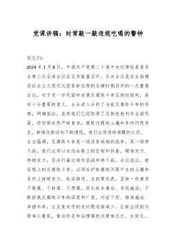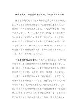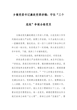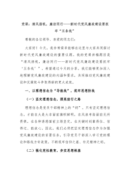 党课:清风扬帆,廉洁同行——新时代党风廉政建设要抓牢“五条线”尊敬的各位领导、亲爱的同志们:大家好!今天,我非常荣幸能够在这里与大家共同探讨新时代党风廉政建设的重要议题。我的党课讲稿题目是“清风扬帆,廉洁同行——新时代党风廉政建设要抓牢‘五条线’”。希望通过今天的分享,我们能够更加深入地理解党风廉政建设的内涵和要求,共同推动党风廉政建设和反腐败斗争取得新的更大成效。一、以理想信念为“导航线”,筑牢思想防线(一)坚定理想信念,照亮前行之路理想信念是党员干部精神上的“钙”。只有坚定理想信念,才能在大是大非面前旗帜鲜明,在风浪考验面前无所畏惧,在各种诱惑面前立场坚定,在关键时刻靠得住、信得过、能放心...