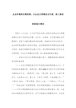 生态环境局专题党课:以生态文明建设为引领,深入推进美丽城乡建设 党的十八大以来,以习近平同志为核心的党中央把生态文明建设摆在全局工作的突出位置,全方位、全地域、全过程加强生态环境保护,实现了由重点整治到系统治理、由被动应对到主动作为、由全球环境治理参与者到引领者、由实践探索到科学理论指导的重大转变,美丽中国建设迈出重大步伐。我们要深学细悟习近平生态文明思想,以生态文明建设为引领,深入推进美丽城乡建设。 一、深刻认识生态文明建设的重大意义,增强美丽城乡建设的责任感和使命感 (一)生态文明建设是关系中华民族永续发展的根本大计。中华民族向来尊重自然、热爱自然,绵延5000多年的中华文明孕育着丰...