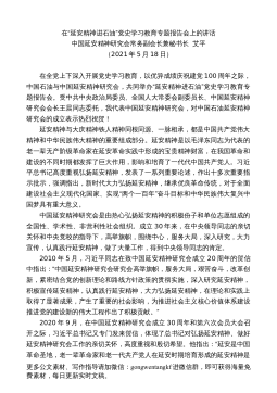 在“延安精神进石油”党史学习教育专题报告会上的讲话中国延安精神研究会常务副会长兼秘书长艾平(2021年5月18日)在全党上下深入开展党史学习教育,以优异成绩庆祝建党100周年之际,中国石油与中国延安精神研究会,共同举办“延安精神进石油”党史学习教育专题报告会。受中共中央政治局委员、全国人大常委会副委员长、中国延安精神研究会会长王晨同志委托,我代表中国延安精神研究会,对中国石油延安精神研究会的成立表示热烈祝贺!延安精神与大庆精神铁人精神同根同源、一脉相承,都是中国共产党伟大精神和中华民族伟大精神的重要组成部分。延安精神是以毛泽东同志为代表的老一辈无产阶级革命家在延安革命实践中形成的宝贵精神财富,...