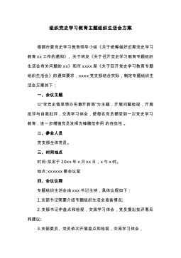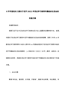 X市市直机关工委关于召开2021年党史学习教育专题组织生活会的实施方案各基层党组织:根据习近平总书记在党史学习教育动员大会上重要讲话精神和中央、省委、市委关于在党史学习教育中召开专题组织生活会的安排部署,按照《中共xx市委党史学习教育领导小组办公室中共xx市委组织部关于在党史学习教育中组织召开专题组织生活会的通知》(x学组办发〔2021〕18号)要求,经机关一支部委员会研究,现就在党史学习教育中组织召开专题组织生活会制定如下实施方案。一、会议主题聚焦“学党史、悟思想、办实事、开新局”,围绕“学史明理、学史增信、学史崇德、学史力行”这一目标,盘点收获、检视问题、深刻剖析,推动广大基层党组织和党员...