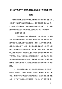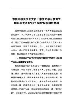 市委办机关支部党员干部党史学习教育专题组织生活会“四个方面”检视剖析材料按照市委办机关支部召开党史学习教育专题组织生活会的要求,本人认真学习了习近平总书记在党史学习教育动员大会上和庆祝中国共产党成立100周年大会上的重要讲话,通读了党中央指定的习近平《论中国共产党历史》等4本学习材料,夯实了思想基础。同时,与支部党员开展交心谈心,虚心听取意见和建议。下面,我结合思想和工作实际,重点围绕“四个方面”作检视剖析。一、学习习近平总书记在庆祝中国共产党成立100周年大会上的重要讲话情况聆听和阅读习近平总书记“七一”重要讲话,我感慨万千心潮澎湃,听出了自信,读出了伟大,学出了力量。讲话博大精深,是一篇闪...