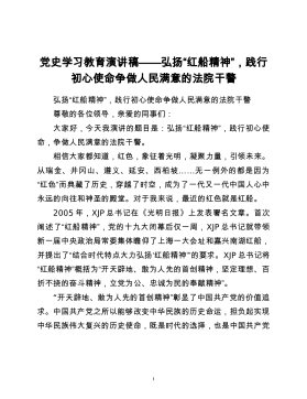 党史学习教育演讲稿——弘扬“红船精神”,践行初心使命争做人民满意的法院干警弘扬“红船精神”,践行初心使命争做人民满意的法院干警尊敬的各位领导,亲爱的同事们:大家好,今天我演讲的题目是:弘扬“红船精神”,践行初心使命,争做人民满意的法院干警。相信大家都知道,红色,象征着光明,凝聚力量,引领未来。从瑞金、井冈山、遵义、延安、西柏坡……无一例外的都是因为“红色”而典藏了历史,穿越了时空,成为了一代又一代中国人心中永远的向往和神圣的殿堂。对于我来说,最近的红色就是红船。2005年,XJP总书记在《光明日报》上发表署名文章。首次阐述了“红船精神”,党的十九大闭幕后仅一周,XJP总书记就带领新一届中央政治...