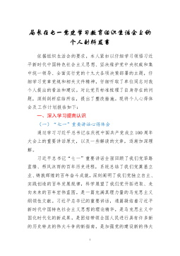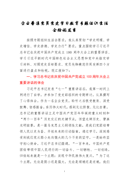 ·1国有企业领导班子党史学习教育专题组织生活会对照检查材料(集团公司)根据集团党委《关于召开党史学习教育专题组织生活会的通知》要求,现就xxxx党支部对照检查情况报告如下:一、检视问题情况(一)检视党支部组织开展党史学习教育情况在集团党委和xxxx党总支的领导下,xxxx机关党支部围绕“学党史、悟思想、办实事、开新局”主题,深入贯彻“学史明理、学史增信、学史崇德、学史力行”要求,认真谋划,积极推动,认真组织开展“学党史悟初心强党性”领读者活动、“朗读红色经典献礼建党百年”专题诵读活动、“缅怀革命先烈,传承红色精神”主题党日活动、“坚守初心担使命我为群众办实事”实践活动等,全面开展党史学习教育,...