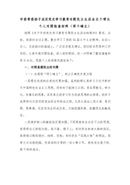 市委常委班子成员党史学习教育专题民主生活会五个带头个人对照检查材料(两个确立)按照《关于开好党史学习教育专题民主生活会的通知》要求,会前,我紧扣会议主题,重点学习了党的XX届X中X会精神,在谈心交心、交流探讨的基础上,广泛征求意见建议,密切联系思想和工作实际,认真开展对照检查,深入剖析原因,进一步明确了整改措施和努力方向。现就个人检视情况报告如下:一、对照查摆找出的问题(一)在感悟“两个确立”,树立正确党史观方面一是理论武装的自觉性还要加强。虽然能够认真学习习近平新时代中国特色社会主义思想,但有时不能持之以恒,存在零散化、碎片化、快餐化的现象,没有真正把学习作为改造思想的必修课,把学习成果转化...