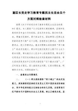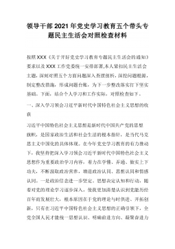 领导干部2021年党史学习教育五个带头专题民主生活会对照检查材料按照XXX《关于开好党史学习教育专题民主生活会的通知》要求以及XXX工作党委统一安排部署,本人紧扣民主生活会主题,深刻对照五个方面问题深入查摆剖析,深挖问题根源,制定整改措施,形成问题台账,为下一步整改落实打下坚实基础。下面,结合个人学习和工作实际,对照检查如下。一、深入学习领会习近平新时代中国特色社会主义思想的收获习近平中国特色社会主义思想是新时代中国共产党的思想旗帜,是国家政治生活和社会生活的根本指针,是当代马克思主义中国化的具体体现。在今年党史学习教育的有力推动下,我坚持把深入学习领会习近平新时代中国特色社会主义思想作为重要...
