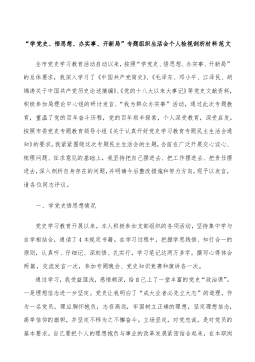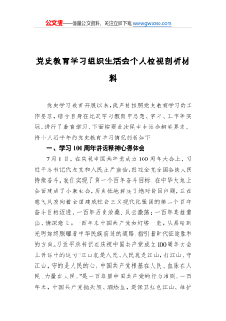学习党史教育组织生活会个人对照检查剖析材料一、参加党史教育情况1、主要收获。深入学习习近平新时代中国特色社会主义思想和习近平总书记重要论述,深刻理解和把握了习近平新时代中国特色社会主义思想的精神实质和实践要求,真正做到用马克思主义中国化最新成果武装头脑、指导实践、推动工作。二是通过党史教育学习,全面检视了自己的“四个意识”牢不牢、“四个自信”足不足、“两个维护”强不强,不断坚定共产党人的政治信仰和价值使命,通过认真学习领会,自觉把思想和行动统一到中央决策部署和习近平总书记的重要讲话要求上来,始终严格政治纪律和政治规矩,在新时代中展现应有的政治担当,思想觉悟和政治担当显著増强。2、参加党史教育情...