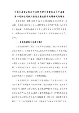 中共X县党史和地方志研究室支部委员会关于县委第一巡察组巡察反馈意见整改阶段进展情况的通报根据县委统一部署,20XX年XX月X日至20XX年XX月XX日,县委第一巡察组对县党史和地方志研究室党支部开展了巡察。20XX年X月,县委第一巡察组向县党史和地方志研究室党支部反馈了巡察意见。按照党务公开原则和巡察工作有关要求,现将巡察整改情况予以公布。一、落实巡察整改主体责任情况1.强化组织领导。成立了以支部书记任组长、县红十字会常务副会长任副组长、各股室相关负责人任成员的巡察整改工作领导小组,统一领导整改工作。领导小组办公室设在县党史和地方志研究室综合股,负责推进整改工作落实、归集资料及撰写材料。X月X...