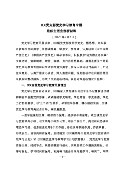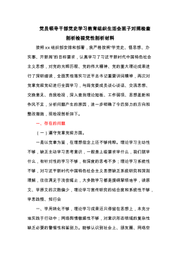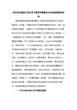 乡镇机关党支部党史学习教育专题组织生活会检视剖析材料范文党史学习教育开展以来,xx镇党支部按照学党史、悟思想、办实事、开新局的目标要求,坚持读原著、学原文、悟原理,认真研读《论中国共产党历史》《中国共产党简史》等必读书目、积极参加“我为群众办实事”实践活动,筑牢明理、增信、崇德、力行的思想基础。根据县委关于开好党史学习教育专题组织生活会的通知要求,在深入学习研讨基础上,广泛征求意见、认真开展谈心谈话、深入查摆问题、深刻剖析存在问题的原因、认真制定整改措施,形成了支部剖析材料。现将对照剖析情况汇报如下:一、xx支部党史学习教育开展情况党史学习教育启动以来,xx镇深入贯彻落实习近平总书记重要讲话精...