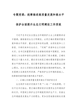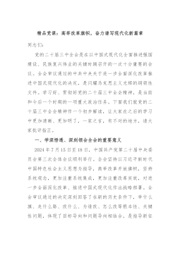 专题党课:持续深化生态文明体制改革,加快推进人与自然和谐共生的中国式现代化中国式现代化是人与自然和谐共生的现代化。当前,我国经济社会发展已进入加快绿色化、低碳化的高质量发展阶段,要把绿色低碳发展作为解决生态环境问题的治本之策,加快形成绿色生产方式和生活方式,厚植高质量发展的绿色底色。党的二十届三中全会通过的《中共中央关于进一步全面深化改革、推进中国式现代化的决定》(以下简称《决定》)提出加快完善落实绿水青山就是金山银山理念的体制机制,力度大、举措实,将进一步统筹好发展和保护的关系,推动绿水青山的自然财富、生态财富转化为社会财富、经济财富。推动《决定》提出的改革措施在我省落实落地,必将促进我省经...