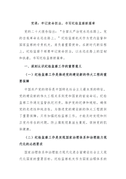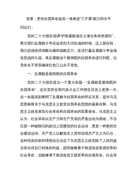党课:坚持自我革命提高一体推进“三不腐”能力和水平同志们:党的二十大报告强调“铲除腐败滋生土壤任务依然艰巨”,警示我们反腐败斗争还远未到大功告成的时候。迈上新征程,我们必须保持清醒头脑和战略定力,坚决打赢反腐败斗争这场攻坚战持久战,将反腐败这个最彻底的自我革命进行到底,以党的永不变质确保红色江山永不变色。一、反腐败是最彻底的自我革命党的二十大报告提出一个重大命题—“反腐败是最彻底的自我革命”,这在党的全国代表大会工作报告历史上是第一次。这一命题深刻阐明了反腐败与自我革命的辩证关系,是对马克思恩格斯关于马克思主义政党自我革命思想的最新诠释。马克思主义政党肩负社会革命和自我革命的双重使命。马克思主...
