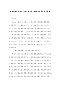 学习贯彻二十届三中全会精神专题党课:牢牢把握全面深化改革的根本目的,持之以恒把改革开放进行到底 党的二十届三中全会,是在以中国式现代化全面推进强国建设、民族复兴伟业的关键时期举行的一次十分重要的会议。习近平总书记受中央政治局委托所作的工作报告,全面总结了党的二十届二中全会以来中央政治局的工作,是一个高屋建瓴、统揽全局、气势恢宏、催人奋进的好报告。全会通过的《决定》,是在新的历史起点上推进全面深化改革向广度和深度进军的又一次总动员、总部署,既是党的十八届三中全会以来全面深化改革的实践续篇,也是新征程推进中国式现代化的时代新篇,充分体现了以习近平同志为核心的党中央完善和发展中国特色社会主义制度、...