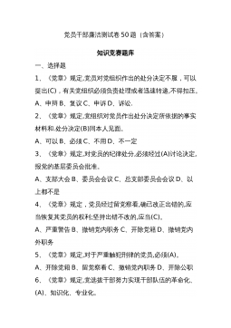 党员干部廉洁测试卷50题(含答案)知识竞赛题库一、选择题1、《党章》规定,党员对党组织作出的处分决定不服,可以提出(C),有关党组织必须负责处理或者迅速转递,不得扣压。A、申辩B、复议C、申诉D、诉讼.2、《党章》规定,党组织对党员作出处分决定所依据的事实材料和.处分决定(B)同本人见面。A、可以B、必须C、不用D、不一定3、《党章》规定,对党员的纪律处分,必须经过(A)讨论决定,报党的基层委员会批准。A、支部大会B、委员会会议C、总支部委员会会议D、以上都不是4、《党章》规定,党员经过留党察看,确已改正出错的,应当恢复其党员的权利;坚持出错不改的,应当(C)。A、严重警告B、撤销党内职务C、...