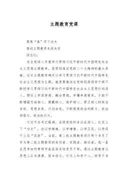 党内主题教育党课讲稿:凝心铸魂创伟业踔厉奋发向复兴开展好学习贯彻习近平新时代中国特色社会主义思想主题教育为开展好学习贯彻习近平新时代中国特色社会主义思想主题教育,我们党近期召开了三次会议,包括3月30日中共中央政治局会议、中共中央政治局第四次集体学习以及4月3日学习贯彻习近平新时代中国特色社会主义思想主题教育工作会议。深刻领会这三次会议精神,对于开展好学习贯彻习近平新时代中国特色社会主义思想主题教育,具有重要的指导意义。一、深刻理解开展主题教育的重要意义习近平总书记指出:“以县处级以上领导干部为重点在全党深入开展学习贯彻新时代中国特色社会主义思想主题教育,是贯彻落实党的二十大精神的重大举措,对...