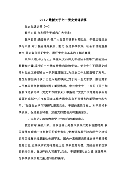 2017最新关于七一党史党课讲稿 党史党课讲稿【一】 教学对象:党员领导干部和广大党员; 教学目的:通过教学,使广大党员明确新时期党员、干部加强党史学习研究,对于提高自身素质、能力,促进科学发展、社会和谐的重要意义,并对如何学好党史、用好党史有基本的了解和掌握; 欲知大道,必先为史。注重从党的历史和经验中汲取开拓前进的智慧和力量,是党的一个优良传统和政治优势。党中央在不同历史时期对党史工作都作出一系列重要指示,为党史工作发展指明了方向。党先后作出两个关于历史问题的决议,对于同一全党思想、推动党和人民事业开创新局面起到了重要作用。中共中央专门下发的《关于加强和改进新形式下党史工作的意见》...