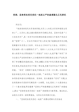 党课:坚持党性党风党纪一起抓以严的基调强化正风肃纪 同志们: “执政党的党风关系党的形象,关系人心向背,关系党和国家生死存亡”。从历史上看,注重加强党的作风建设,形成、坚持与弘扬“三大优良作风”,是一百多年来党的建设的基本经验与中国共产党成功的“密码”之一。对当代中国共产党人而言,“能不能解决好作风问题,是衡量对马克思主义信仰、对社会主义和共产主义信念、对党和人民忠诚的一把十分重要的尺子”。党的十八大以来,以习近平同志为核心的党中央以贯彻落实“八项规定”为切入点,把严整“四风”作为全面从严治党的突破口,以加强党的作风建设推进全面从严治党,取得了举世瞩目的显著成效。同时,清醒认识到:“作风问...