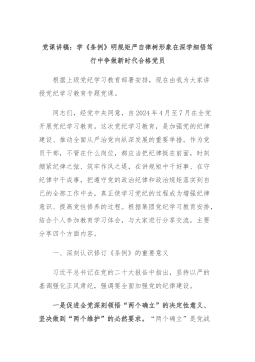 党课讲稿:学《条例》 明规矩 严自律 树形象 在深学细悟笃行中争做新时代合格党员