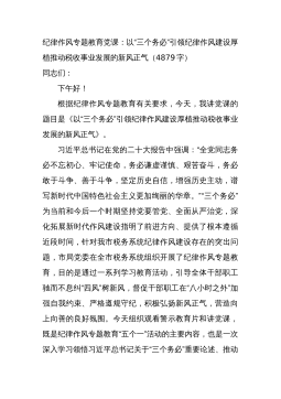 纪律作风专题教育党课:以“三个务必”引领纪律作风建设厚植推动税收事业发展的新风正气(4879字)同志们:下午好!根据纪律作风专题教育有关要求,今天,我讲党课的题目是《以“三个务必”引领纪律作风建设厚植推动税收事业发展的新风正气》。习近平总书记在党的二十大报告中强调:“全党同志务必不忘初心、牢记使命,务必谦虚谨慎、艰苦奋斗,务必敢于斗争、善于斗争,坚定历史自信,增强历史主动,谱写新时代中国特色社会主义更加绚丽的华章。”“三个务必”为当前和今后一个时期坚持党要管党、全面从严治党,深化拓展新时代作风建设指明了前进方向、提供了根本遵循近段时间,针对我市税务系统纪律作风建设存在的突出问题,市局党委在全市...