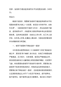 党课:加强班子建设提高领导水平实现更好发展(5455字)同志们:根据计划安排,我围绕“加强班子建设提高领导水平实现更好发展”给大家上一次党课。俗话说“火车快不快,全靠车头带”。一级党组织班子就是“火车头”,所以加强班子建设,提高领导水平,才能更有力团结带领本单位实现高质量发展。总的来说就是要:在政治上讲大局,在工作上谋开拓,在作风上求务,在廉政上重自律,为推动高质量发展作出积极的努力和贡献。一、领导干部要有干事创业的“一股劲”今年是是全面贯彻党的二十大精神和“十四五”规划的关键之年,要实现“四个确保”,各行各业、各项工作都面临着严峻挑战,压力很大、任务很重。能否在严峻挑战之时,抓住机遇,激发动...