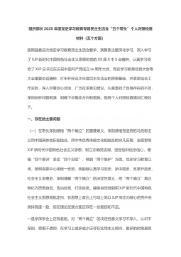 组织部长202X年度党史学习教育专题民主生活会“五个带头”个人对照检查材料(五个方面)按照县委这次党史学习教育民主生活会要求,我聚焦主题深化学习,深入学习了XJP新时代中国特色社会主义思想和党的XX届X中X会精神,认真学习领会了XJP总书记在庆祝中国共产党成立xx周年大会、党史学习教育动员大会等大会重要讲话精神,打牢开好这次年度民主生活会的思想基础,并紧密结合工作实际,深入开展谈心谈话,广泛征求意见建议,认真查找了自身存在的不足,深刻剖析问题根源,明确下步整改方向和措施。现将个人对照检查情况汇报如下。一、存在的主要问题(一)在带头深刻感悟“两个确立”的重要意义,深刻感悟党坚持把马克思主义同中国...