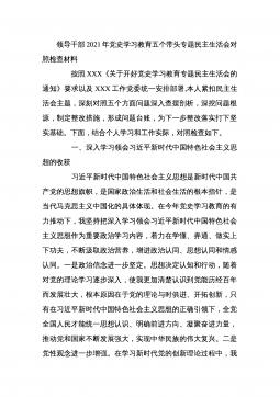 领导干部2021年党史学习教育五个带头专题民主生活会对照检查材料 按照XXX《关于开好党史学习教育专题民主生活会的通知》要求以及XXX工作党委统一安排部署,本人紧扣民主生活会主题,深刻对照五个方面问题深入查摆剖析,深挖问题根源,制定整改措施,形成问题台账,为下一步整改落实打下坚实基础。下面,结合个人学习和工作实际,对照检查如下。 一、深入学习领会习近平新时代中国特色社会主义思想的收获 习近平新时代中国特色社会主义思想是新时代中国共产党的思想旗帜,是国家政治生活和社会生活的根本指针,是当代马克思主义中国化的具体体现。在今年党史学习教育的有力推动下,我坚持...