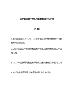 市纪检监察干部队伍教育整顿工作汇报(4篇)1.县纪委监委工作汇报:“三举措”扎实推动教育整顿学习教育环节走深走实2.2023某县关于开展纪检监察干部队伍教育整改的工作总结汇报3.2023年县开展纪检监察干部队伍教育整顿工作总结汇报4.在纪检监察干部队伍教育整顿大会上的报告市纪检监察干部队伍教育整顿工作汇报市纪委监委坚持高起点布局、严标准推进、实举措落实,紧扣教育整顿目标任务,突出以上率下、协调联动,不折不扣落实规定动作,创新谋划自选动作,推动教育整顿有声有色,实现政治效果、纪法效果、社会效果有机统一。现将全市纪检监察干部队伍教育整顿情况简要报告如下:(一)高起点布局,下好“一盘棋”。始终把纪检...