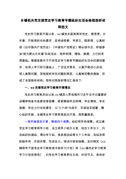 乡镇机关党支部党史学习教育专题组织生活会检视剖析材料范文党史学习教育开展以来,xx镇党支部按照学党史、悟思想、办实事、开新局的目标要求,坚持读原著、学原文、悟原理,认真研读《论中国共产党历史》《中国共产党简史》等必读书目、积极参加“我为群众办实事”实践活动,筑牢明理、增信、崇德、力行的思想基础。根据县委关于开好党史学习教育专题组织生活会的通知要求,在深入学习研讨基础上,广泛征求意见、认真开展谈心谈话、深入查摆问题、深刻剖析存在问题的原因、认真制定整改措施,形成了支部剖析材料。现将对照剖析情况汇报如下:一、xx支部党史学习教育开展情况党史学习教育启动以来,xx镇深入贯彻落实习近平总书记重要讲话精...