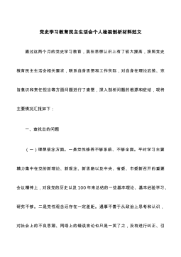 (党员干部)党史学习教育组织生活会个人对照检查剖析材料6篇一按照局党组统一安排,本人坚持读原著、学原文、悟原理,通过参加集中学习研讨、个人自学、聆听党课、与同志交流学习心得、参观学习等形式开展理论学习,认真学习了《中国共产党简史》《毛泽东、邓小平、江泽民、胡锦涛关于中国共产党历史论述摘编》《习近平总书记论中国共产党历史》《习近平总书记新时代中国特色社会主义思想学习问答》《中国共产党简史》,从而树牢“四个意识”,坚定“四个自信”,做到“两个维护”,认真执行党章和习近平总书记新时代中国特色社会主义思想等方面,就学习和工作情况及思想状况对照检查如下:一、党史学习教育情况和收获(一)学习习近平总书记总...