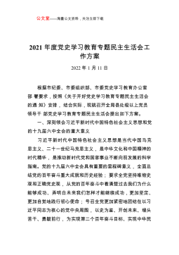 公文堂——海量公文资料,关注立即下载2021年度党史学习教育专题民主生活会工作方案2022年1月11日根据市纪委、市委组织部、市委党史学习教育办公室部署要求,按照《关于开好党史学习教育专题民主生活会的通知》安排,结合实际,现就召开全局县处级以上党员领导干部党史学习教育专题民主生活会提出如下方案。一、深刻领会习近平新时代中国特色社会主义思想和党的十九届六中全会的重大意义习近平新时代中国特色社会主义思想是当代中国马克思主义、二十一世纪马克思主义,是中华文化和中国精神的时代精华,是推动新时代党和国家事业不断向前发展的科学指南。党的十九届六中全会具有重要的里程碑意义,全面总结党的百年奋斗重大成就和历史...