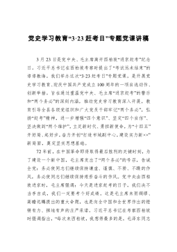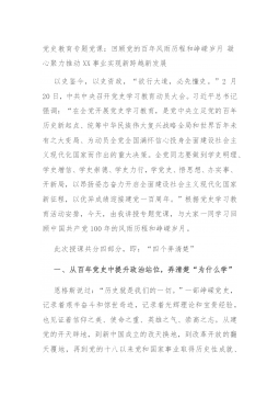 党史教育专题党课:回顾党的百年风雨历程和峥嵘岁月凝心聚力推动XX事业实现新跨越新发展以史鉴今,以史资政,“欲行大道,必先懂史。”2月20日,中共中央召开党史学习教育动员大会。习近平总书记强调:“在全党开展党史学习教育,是党中央立足党的百年历史新起点、统筹中华民族伟大复兴战略全局和世界百年未有之大变局、为动员全党全国满怀信心投身全面建设社会主义现代化国家而作出的重大决策。全党同志要做到学史明理、学史增信、学史崇德、学史力行,学党史、悟思想、办实事、开新局,以昂扬姿态奋力开启全面建设社会主义现代化国家新征程,以优异成绩迎接建党一百周年。”根据党史学习教育活动安排,今天,由我讲授专题党课,与大家一同...