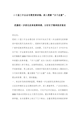 二十届三中全会专题党课讲稿:深入理解“五个注重”,把握进一步深化改革统筹部署,以钉钉子精神抓好落实同志们:党的二十届三中全会通过的《中共中央关于进一步全面深化改革推进中国式现代化的决定》,是新时代新征程上推动全面深化改革向广度和深度进军的总动员、总部署。习近平总书记关于《中共中央关于进一步全面深化改革、推进中国式现代化的决定》的说明指出,决定稿锚定2035年基本实现社会主义现代化目标,重点部署未来五年的重大改革举措,“五个注重”成为《决定》内容摆布鲜明特点。我们要深入学习领会,全面贯彻落实,扎实推动经济体制改革工作开创新局面、再上新台阶,为推进中国式现代化持续注入强劲动力。今天的专题党课,重点...