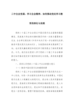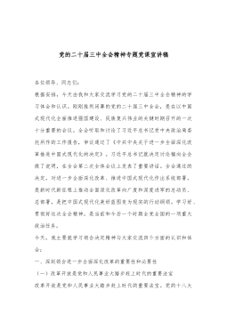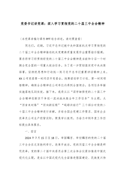 专题党课:学习贯彻党的二十届三中全会精神,切实践行金融工作政治性、人民性党的二十届三中全会指出:“面对人民群众新期待,必须自觉把改革摆在更加突出位置,紧紧围绕推进中国式现代化进一步全面深化改革。”党的二十届三中全会开启了进一步全面深化改革的新征程,将深化金融改革推入了新阶段。公司上下要始终坚持以习近平新时代中国特色社会主义思想为指导,认真落实党中央关于金融系统党的建设的决策部署,积极践行金融工作政治性、人民性,强化主体责任,狠抓学习贯彻,持续正风肃纪,深入推进模范机关建设,以高质量机关党建推动高质量发展。一、在讲政治上立标杆,践行“两个维护”公司机关作为国有金融企业机关,要深刻认识到政治性是第...