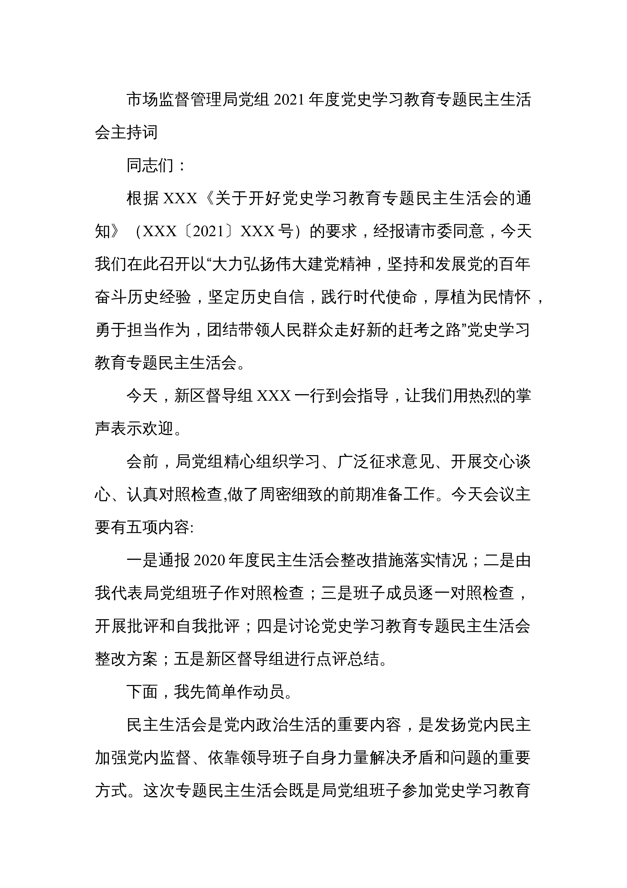市场监督管理局党组2021年度党史学习教育专题民主生活会主持词同志们:根据XXX《关于开好党史学习教育专题民主生活会的通知》(XXX〔2021〕XXX号)的要求,经报请市委同意,今天我们在此召开以“大力弘扬伟大建党精神,坚持和发展党的百年奋斗历史经验,坚定历史自信,践行时代使命,厚植为民情怀,勇于担当作为,团结带领人民群众走好新的赶考之路”党史学习教育专题民主生活会。今天,新区督导组XXX一行到会指导,让我们用热烈的掌声表示欢迎。会前,局党组精心组织学习、广泛征求意见、开展交心谈心、认真对照检查,做了周密细致的前期准备工作。今天会议主要有五项内容:一是通报2020年度民主生活会整改措施落实情况...