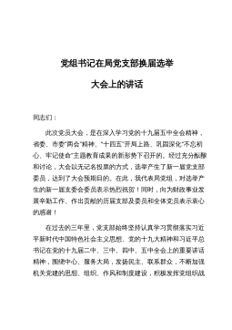 本文系邮箱投稿,仅供学习参考,请勿照搬照抄!在X党总支换届选举大会上的讲话同志们:本次党员大会,是在全局上下深入贯彻党的十九大精神之际召开的。经过充分的酝酿和讨论,大会以无记名投票的方式,选举产生了新一届党总支委员,达到了大会预期的目的。在此,我代表县局党组,对选举产生的新一届总支委员表示热烈祝贺!同时,向为X事业发展辛勤工作、作出贡献的历届党总支及委员、各基层党支部和全体党员同志们表示诚挚的问候!在过去的三年里,县局党总支始终坚持全面落实习近平新时代中国特色社会主义思想,认真贯彻党的十八大、十九大精神,深入推进“两学一做”学习教育常态化制度化,围绕中心、服务大局,发扬民主、联系群众,不断加强...