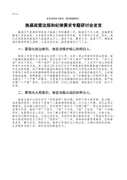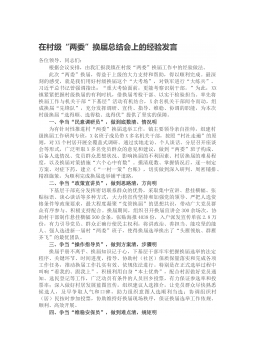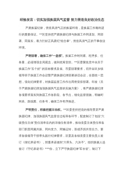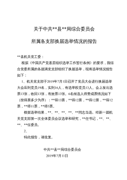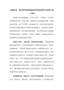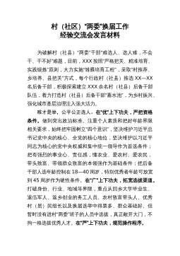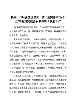 换届工作经验交流发言:突出落实落细“五个三”高标准完成县乡领导班子换届工作XX县委坚持党管干部原则,严格规范干部选拔任用工作,在县乡换届工作中,突出落细落实“五个三”措施,确保换届工作稳妥有序、圆满完成。突出做到“三个到位”,加强组织领导。一是研究部署到位。县委及时成立了换届工作领导组,召开X次常委会、X次全会、X次工作会,专题学习领会省市文件和会议精神,深入全面做好安排部署。二是领导包抓到位。县级领导带队专题调研,对XX个乡镇包谈心、包释疑、包解难、包维稳、包选举成功,落实“五包”责任,强化了党的领导。三是指导督导到位。强化领导组办公室作用,研究制定“X+X”方案,集成编印《指导手册》《工作...