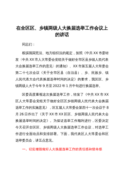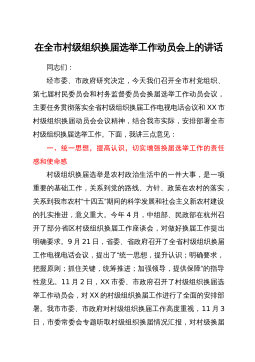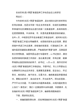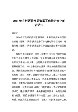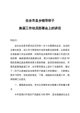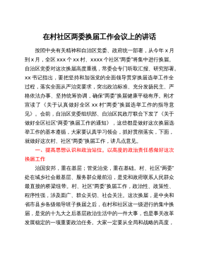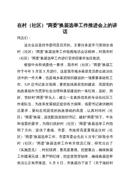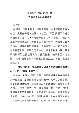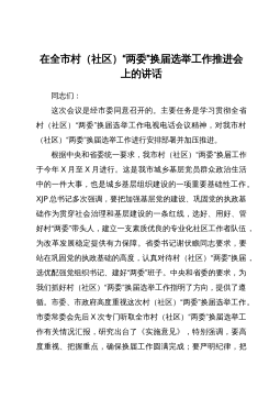在全县村(社区)“两委”换届工作动员部署会暨业务培训班开班仪式上的讲话同志们:近期,省委、市委相继召开了全省、全市村(社区)“两委”换届工作会议,为进一步贯彻落实会议精神,高质量做好我县换届工作,确保换出好班子好风气好局面,今天我们召开全县村(社区)“两委”换届工作动员部署会暨业务培训班开班仪式,全面铺开我县村(社区)“两委”换届工作。下面,我就作好此项工作,强调三方面意见。一、政治站位一定要“高”,聚思想、汇共识,深刻理解村(社区)“两委”换届工作的重要意义这次村(社区)“两委”换届,恰逢建党100周年和实施“十四五”规划的开局之年,也是村(社区)“两委”班子任期由3年变5年,与县乡换届同步...