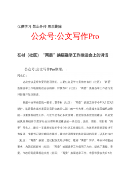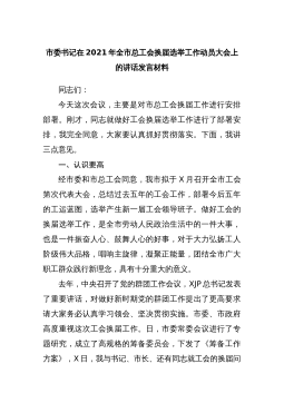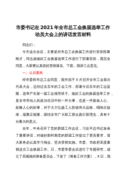 市委书记在2021年全市总工会换届选举工作动员大会上的讲话发言材料同志们:今天这次会议,主要是对市总工会换届工作进行安排部署刚才,同志就做好工会换届选举工作进行了部署安排,我完全同意,大家要认真抓好贯彻落实。下面,我讲三点意见。一、认识要高经市委和市总工会同意,我市拟于X月召开全市工会第次代表大会,总结过去五年的工会工作,部署今后五年的工运蓝图,选举产生新一届工会领导班子。做好工会的换届选举工作,是全市劳动人民政治生活中的一件大事,也是一件振奋人心、鼓舞人心的好事,对于大力弘扬工人阶级伟大品格,唱响主旋律,凝聚正能量,团结全市广大职工群众践行新理念,具有十分重大的意义。去年,中央召开了党的群团...