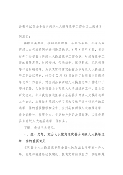 县委书记在全县县乡两级人大换届选举工作会议上的讲话同志们:根据中央要求,按照省委部署,今年下半年,全省县乡两级人大代表将同步进行换届选举。X月X日至X日,省委召开了全省县乡两级人大换届选举工作会议,对换届选举工作的指导思想、时间安排、代表选举、纪律要求、组织领导等作出明确部署。为认真贯彻落实全省县乡两级人大换届选举工作会议精神,州委于X月XX日召开了全州县乡两级换届选举工作会议,对全州县乡两级人大换届选举工作进行了安排部署。为做好我县县乡两级人大换届选举工作,经县委研究决定,今天我们在这里召开全县县乡两级人大换届选举工作会议,主要任务是深入学习贯彻习近平总书记关于换届选举工作的重要指示和全省、...