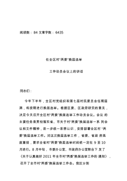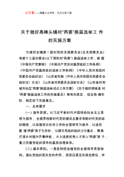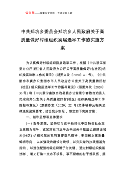 公文堂——海量公文资料,关注立即下载中共郑坑乡委员会郑坑乡人民政府关于高质量做好村级组织换届选举工作的实施方案为认真做好村级组织换届选举工作,根据《中共浙江省委办公厅浙江省人民政府办公厅关于高质量做好村(社区)组织换届选举工作的意见》(浙委办发〔2020〕40号)、《中共丽水市委办公室丽水市人民政府办公室关于高质量做好村(社区)组织换届选举工作的指导意见》(丽委办发〔2020〕30号)和《中共景宁畲族自治县委办公室景宁畲族自治县人民政府办公室关于高质量做好村(社区)组织换届选举工作的指导意见》(景委办发〔2020〕22号)文件精神及相关法律法规政策要求,结合我乡实际,制定如下实施方案:一、指导...
