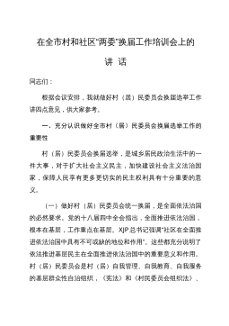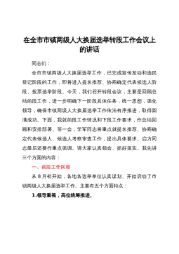 在全市市镇两级人大换届选举转段工作会议上的讲话同志们:全市市镇两级人大换届选举工作,已完成宣传发动和选民登记阶段的工作,即将进入提名推荐、协商确定代表候选人阶段、投票选举阶段。今天,我们召开转段会议,主要是回顾总结前段工作,进一步明确下一阶段具体任务,统一思想,强化领导,确保市镇两级人大换届选举工作依法有序推进,取得圆满成功。下面,我就前段工作情况和下段工作要求,作总结回顾和安排部署。等一会,学军同志将重点就提名推荐、协商确定代表候选人、候选人考察审查工作,提出具体要求。启方同志最后还要作重点强调。请大家认真领会、抓好落实。我先讲三个方面的内容:一、前段工作回顾从8月初开始,各地各选举单位认真...