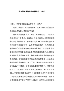 党支部换届选举工作报告【13篇】【篇1】党支部换届选举工作报告 同志们: 现在,我受XX党支部的委托,代表上届支部委员会向会议做工作报告,请同志们审议。 南片党支部现有党员15名,无预备党员。15名党员来自XX三个分中心。自20xx年5月以来,XX党支部在中心党总支的领导下,在全体党员和XX三个分中心员工的大力支持和积极参与下,认真贯彻落实党的十八大精神,紧紧围绕中心公共服务与市场服务两方面的工作,以创建学习型党支部和学习型党员以及服务型党支部为着力点,切实加强支部党员党风廉政建设,切实加强支部党员的使命感和责任意识,切实加强支部党员的思想教育工作,全体党员干部和职工爱岗敬业、努力工作,认...
